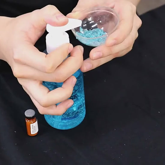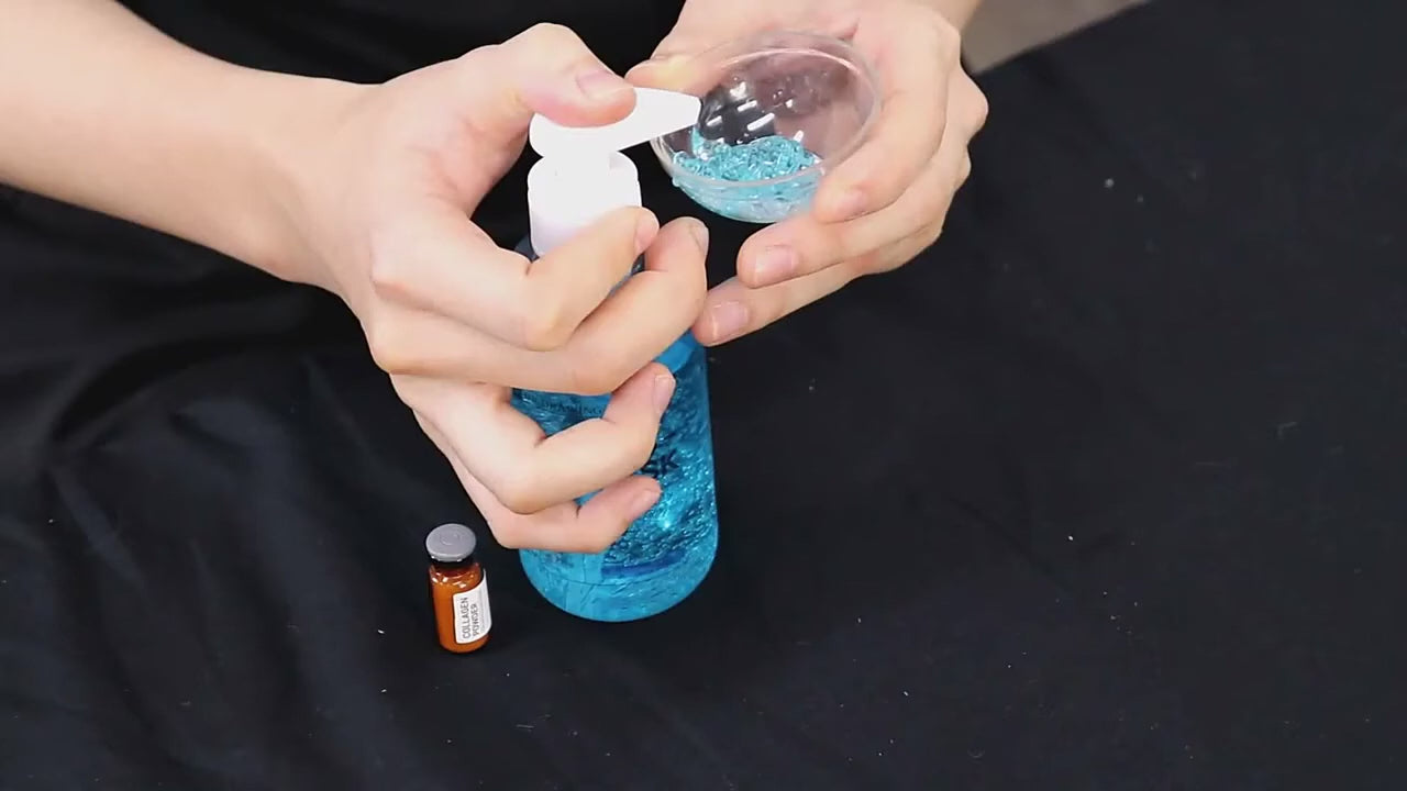 The collagen powder is mixed with the active ingredient concentrate of the Cooling Gel Mask to create a pleasantly cooling gel texture. The fresh mixing allows the ingredients to develop their full potential and effectiveness. The hydrolyzed collagen is absorbed into the skin and takes effect immediately after application - with a visible immediate effect! Skin elasticity is increased, the complexion is rejuvenated and the moisture balance is increased.